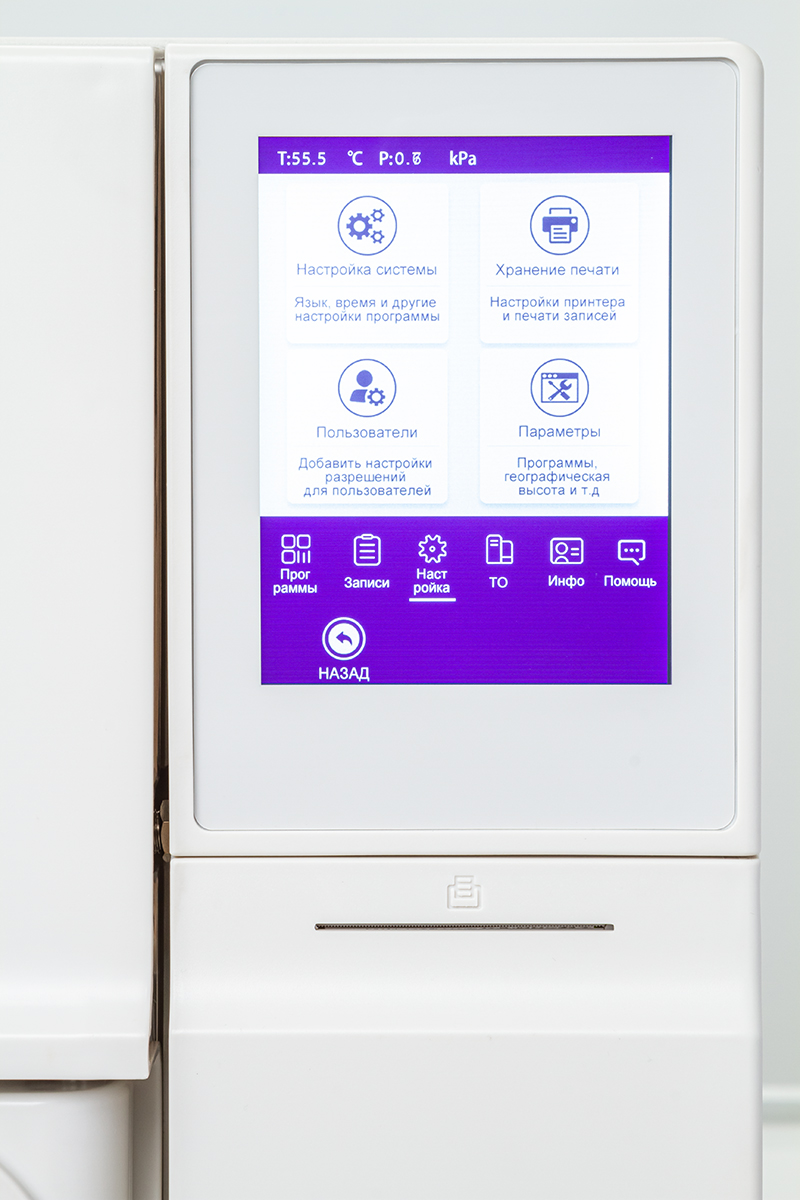 Записи об итогах стерилизации могут сохраняться и записываться в память автоклава напрямую. Также их можно извлечь при помощи принтера, карты памяти или USB разъема.
