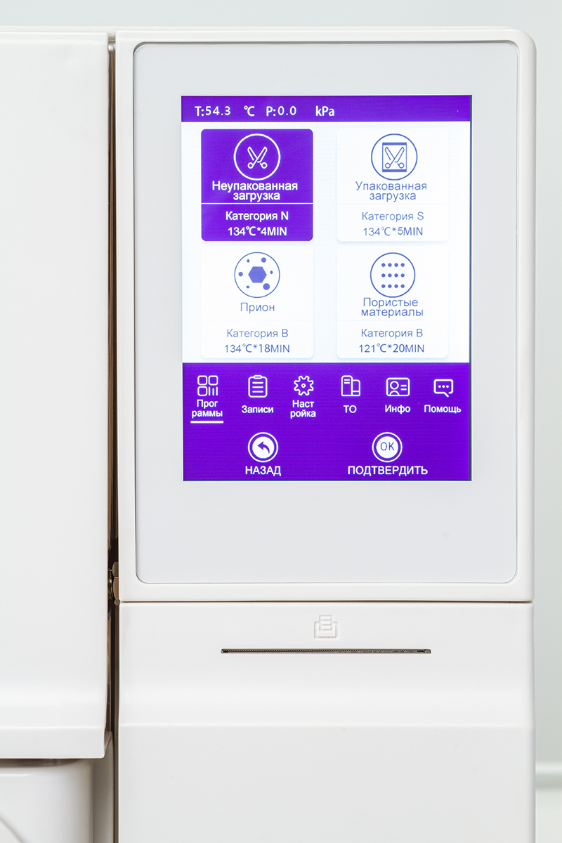 Большой LCD дисплей размером 81x101мм позволяет полностью отслеживать процесс стерилизации и получать подсказки в режиме on-line